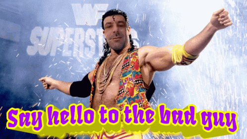 A muscular wrestler, possibly Razor Ramon, with 'Say Hello to the Bad Guy' text and pyrotechnics.