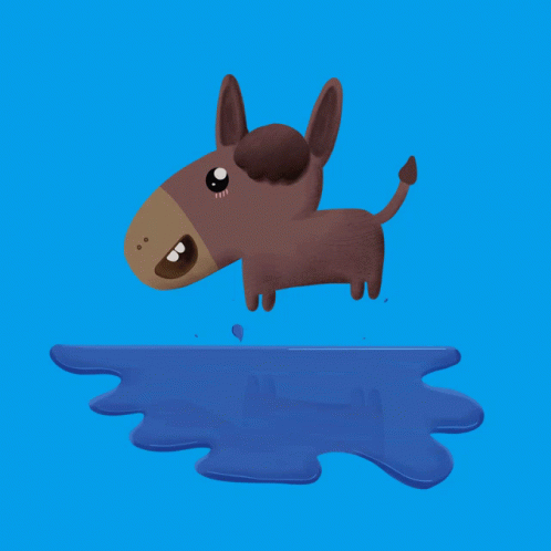 An adorable animated Burro Burroágua, a cute donkey, jumps happily over a blue puddle on a vibrant blue background.