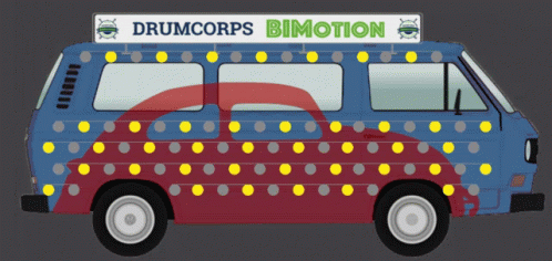 A blue VW bus, decorated with yellow and gray lights, featuring 'DRUMCORPS BIMOTION' and a red car silhouette, associated with Niklas Wagner.