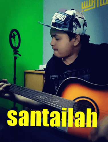 A man playing an acoustic guitar with the word 'santailah' displayed, creating a relaxed atmosphere.