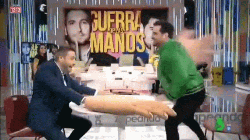 David Bustamante and another man engage in a comedic 'War of the Hands' segment on the Spanish TV show Zapeando.