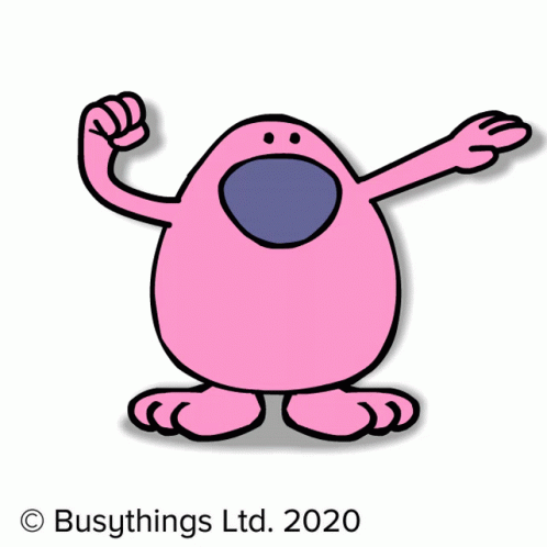 The Busythings Pink Man cartoon character flexing his muscles and showing off his strength.