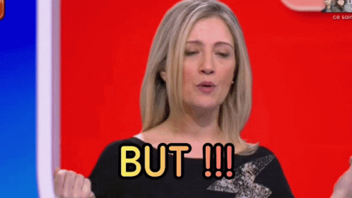 Emilie Mazoyer's expressive reaction with 'BUT !!!' on a red and blue background.