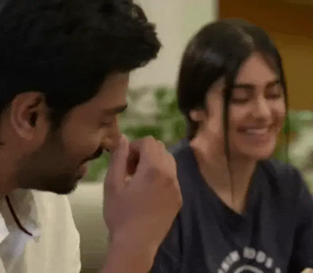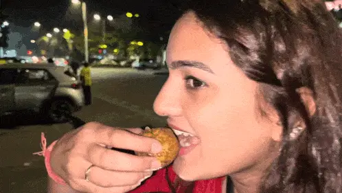 Pyari Varsha enjoying a grilled corn on the cob, taking a big bite with visible delight.
