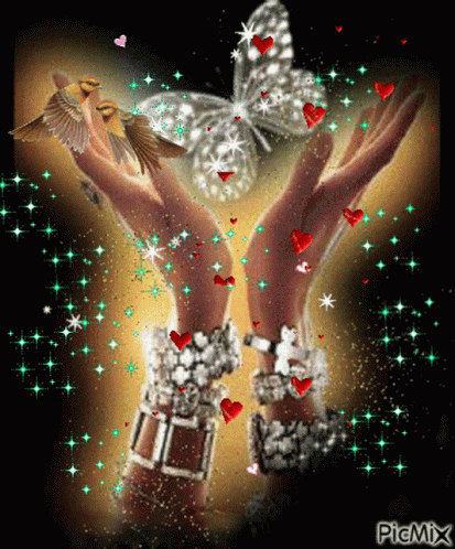 Two hands adorned with sparkling bracelets, holding a butterfly and two birds amidst hearts and glitter.