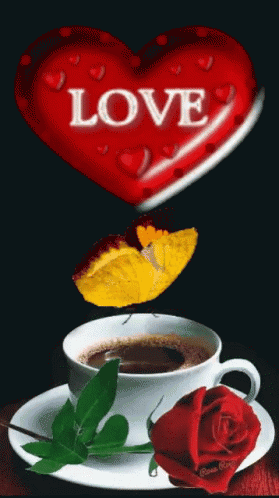 An animated scene featuring a butterfly, a green rose, a red heart with 'Love', and a cup of coffee.