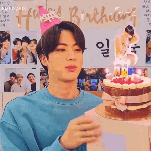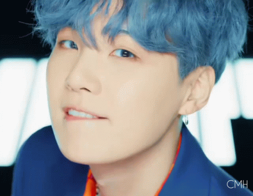 BTS member V (Taehyung) with blue hair from the 'Boy With Luv' era, looking at the camera.