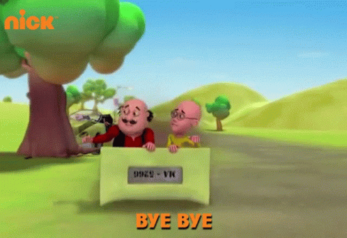 Motu and Patlu wave goodbye from their vehicle, with 'BYE BYE' displayed on screen.