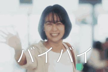 A smiling woman waves goodbye, with "Bye Bye" (バイバイ) displayed in Japanese.