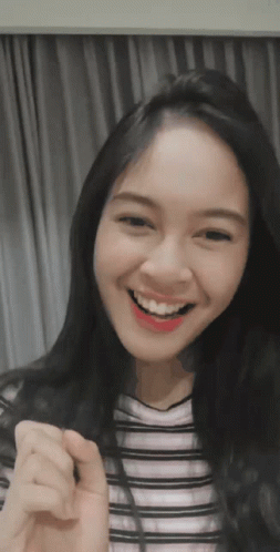 Salma JKT48 waves cheerfully with a bright smile, wearing a striped top against a plain background.