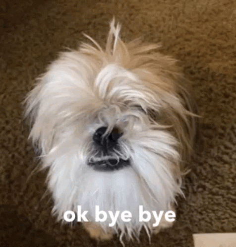 A fluffy white dog with long hair turns its head as the text 'ok bye bye' appears.