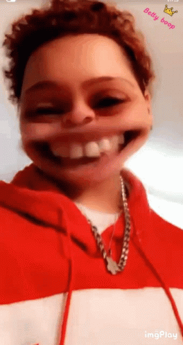 Byfobap7 uses a Big Mouth filter, smiling and laughing in a red and white hoodie.