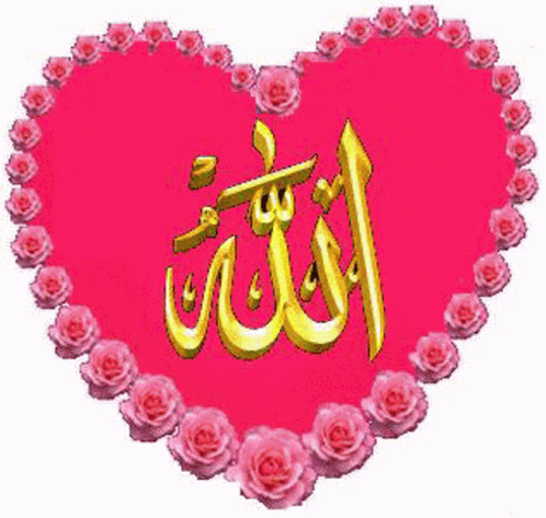 Pink heart with roses and golden Arabic calligraphy: 'Indeed, Allah is the Greatest'.