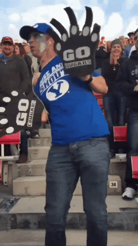 An enthusiastic BYU fan in a blue 'RAISE AND SHOUT' shirt dances and cheers at a football game, showing school spirit.