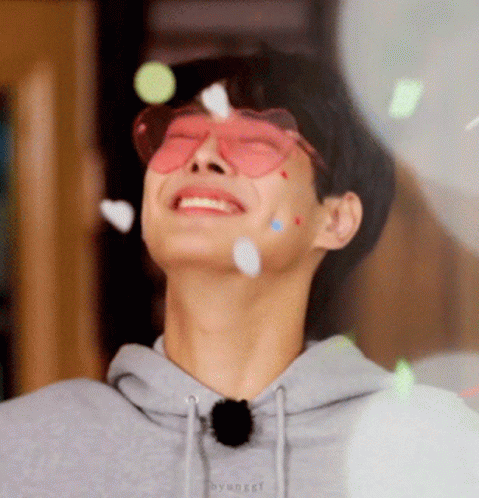Byungchan Choi smiles brightly, wearing a grey hoodie and fun pink heart-shaped sunglasses, with confetti falling around him.