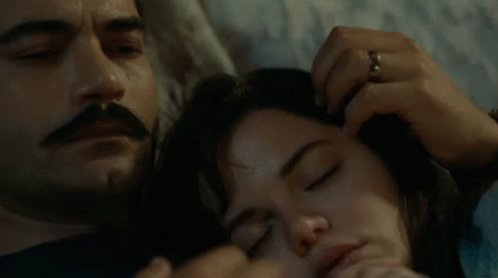 A tender moment between a man and a woman from the Turkish series Bir Zamanlar Cukurova, as they lie in bed.