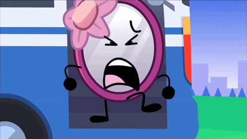 Animated Mirror character from C2BC looking distressed with a pink flower on its head.