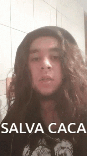 A man with long, dark hair and a beard is seen wearing a black shirt with the text 'SALVA CACA' printed on it.