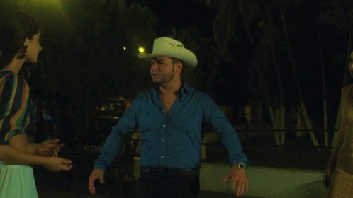 A woman slaps Lenin Ramirez, who is wearing a cowboy hat, in a dramatic nighttime scene.