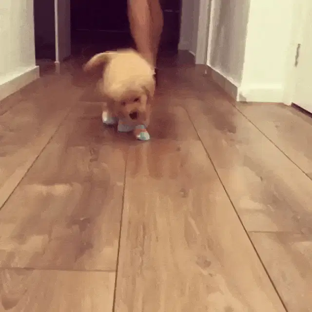 Bob, the brown Pinscher dog, relaxing on a tiled floor with his tongue slightly out.