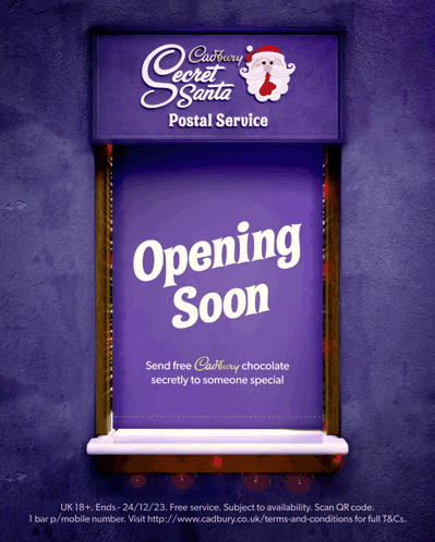Cadbury Secret Santa Postal Service sign announces 'Opening Soon' for sending free chocolate to someone special.