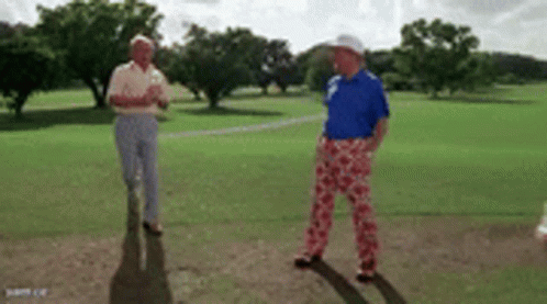 Rocco and friends on a golf course, anticipating a moose encounter from the classic film Caddyshack.