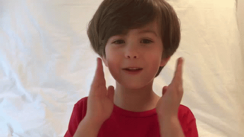 Cade Woodward, a young boy in a red t-shirt, claps his hands and enthusiastically says 'YES!!'
