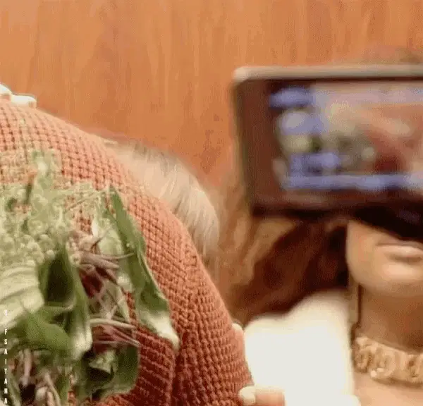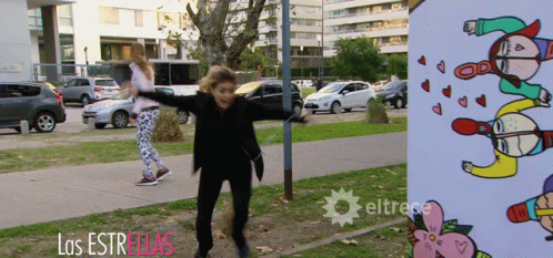 Natalie Perez trips and falls, then quickly hides behind a sign for 'eltrece' and 'Las Estrellas'.