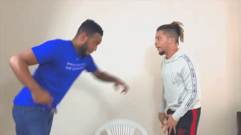 Javi Ghan and another man play a chairs game, resulting in a fall and a broken chair.