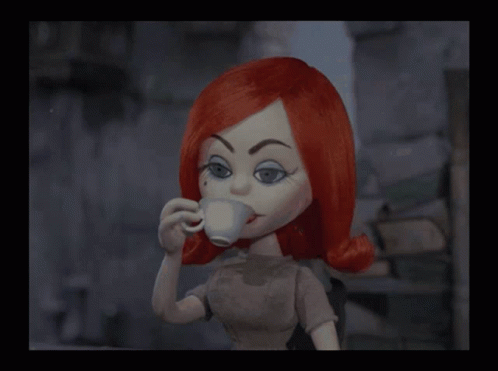 A red-haired animated doll sips coffee from a small cup, enjoying a quiet moment in a stop-motion scene.