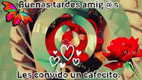 An animated greeting with changing colors, featuring coffee cups, hearts, a butterfly, and a rose, with Spanish text: 'Buenas tardes amig@s, Les convido un cafecito.'