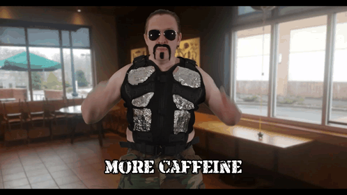 Man with a mustache and sunglasses in a vest demands 'MORE CAFFEINE' in a coffee shop setting.