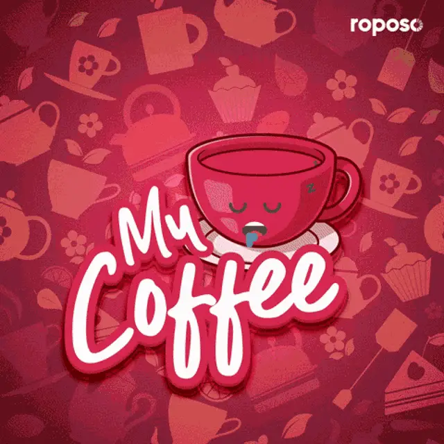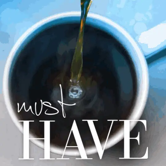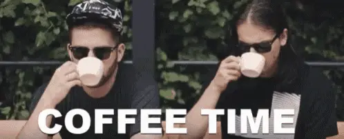 A man in sunglasses and a vest declares 'More caffeine is what helps me to think!' in a coffee shop.