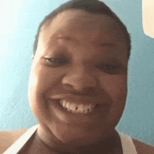 Cahcashun Lovely Peaches smiles broadly in a close-up shot, showing her teeth against a light blue background.
