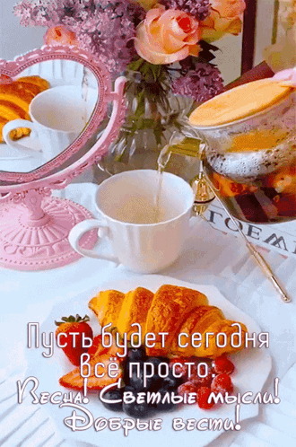A delightful breakfast scene with tea being poured into a cup, alongside a golden croissant and fresh berries.