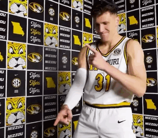 Caleb Grill, a Mizzou basketball player, points while wearing his white and yellow number 21 jersey.