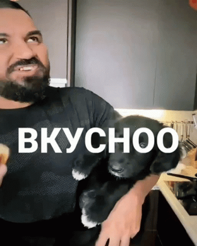 Bulgarian singer Azis eating a snack while holding a cute black puppy, with 'ВКУСНОО' (Delicious) caption.