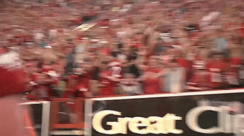 Calgary Stampeders player jumps into the cheering crowd, celebrating with fans in the stadium.