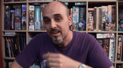 Calla Pacheco makes a shushing gesture, finger to lips, in front of a board game shelf.