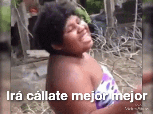 Woman in a patterned top outdoors, with the Spanish text 'Irá cállate mejor mejor' overlaid, expressing strong emotion.