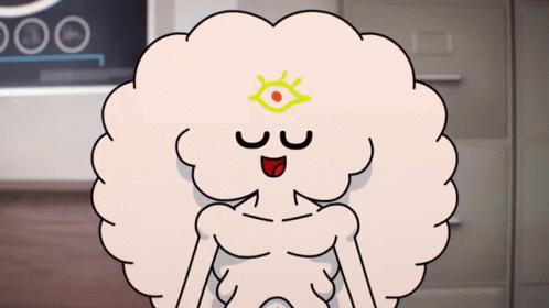 A cloud-like character from El Increible Mundo De Gumball meditates peacefully with a third eye on its forehead.