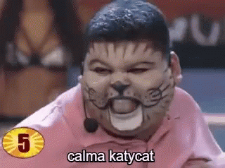 Katy Cat, a person with cat face paint, grins widely while wearing a pink shirt and microphone.