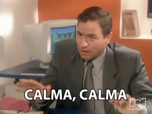A man from 'Yo Soy Betty La Fea' says 'Calma, Calma' and 'Sin Escándalo' in a suit and tie.