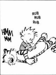 Calvin rubs Hobbes's belly, leading to a mix of pleasure and irritation from the tiger.