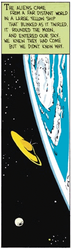 Calvin and Hobbes discuss Calvin's far-fetched science fiction story about aliens, a UFO, and draining the Earth's resources.