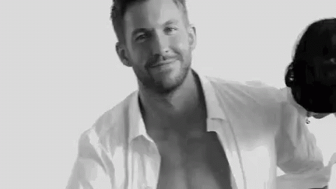 Calvin Harris smiles charmingly while posing for a black and white shot, wearing an unbuttoned white shirt.