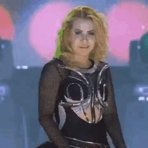 Joelma Mendes in a striking black and silver costume, smiling and pointing directly at the camera.