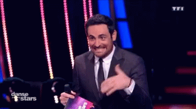 Camille Combal, host of Danse avec les stars, smiles and gestures on stage, holding a show magazine.