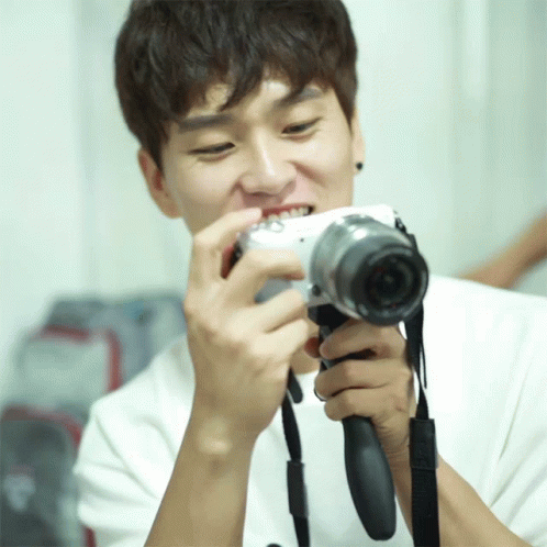 Yoonpic taking a picture with an Olympus camera, smiling and holding the device.