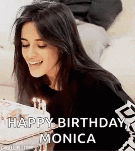 Camila Cabello blows out candles on a birthday cake, celebrating Monica's special day.